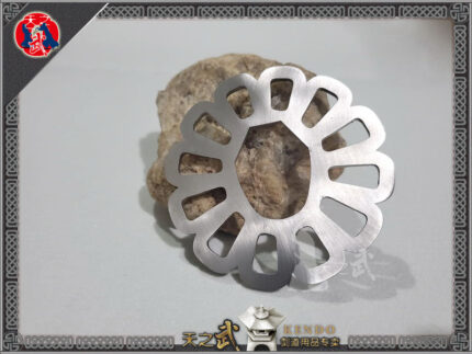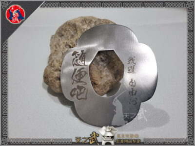 (不动明王剑镡:天之武招牌金属剑镡,经微型车床手工精修,并由光纤激光蚀刻出坚不可摧的不动明王像。)